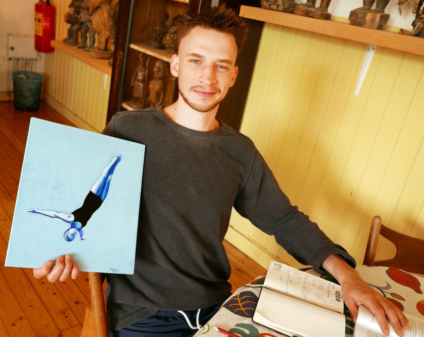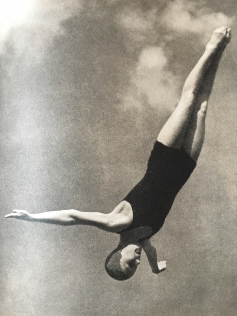 Jag upptäckte Leni Riefenstahls fotografi på Tokalynga, TeaterAlbatross bas i Halland. En tung bok med hennes foto, låg på ett litet bord i entrè. Riefenstahl är en omdebatterad figur, men en storartad konstnär tycker jag. Jag ville gärna ha fotot av kvinnan, som hon fotograferade under olympiaden i Berlin, på framsidan av min bok, men det visade sig vara riktigt dyrköpt. Jag bad Kirill Diomchev, “konstnär in residence” från Belarus, att måla av kvinnan istället!